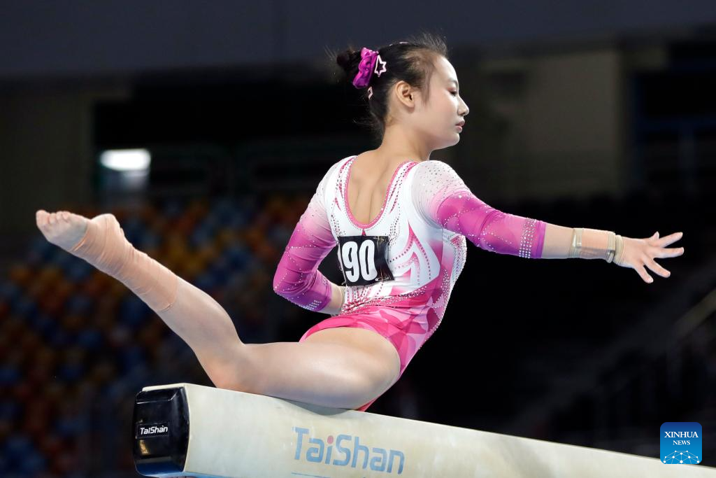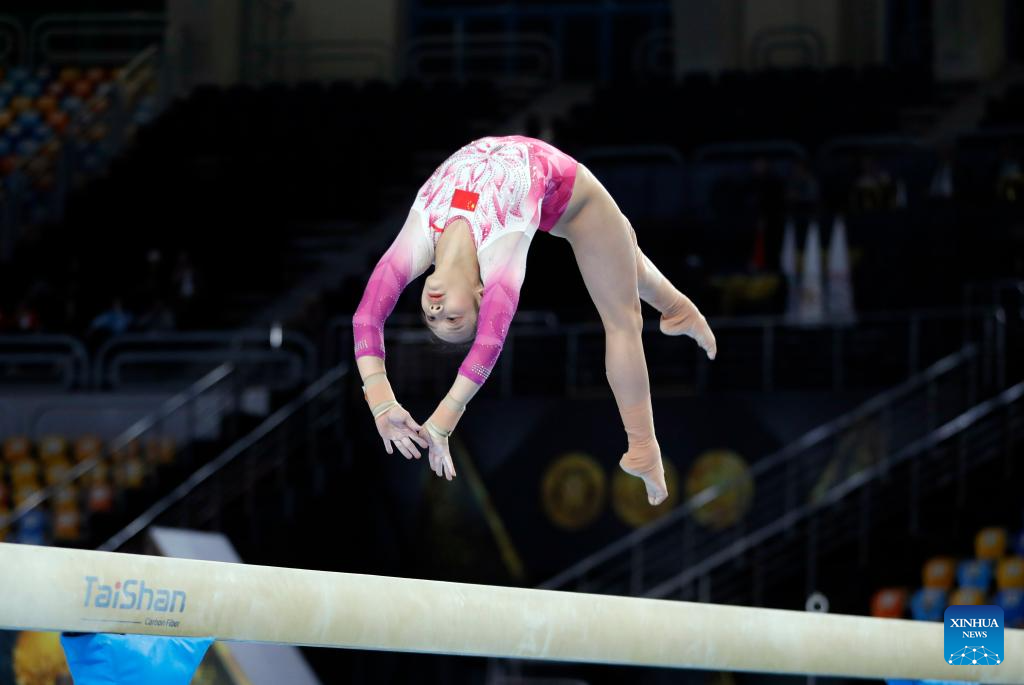 Qiu Qiyuan of China competes in the Balance Beam Final at the 2026 FIG Apparatus World Cup in Cairo, Egypt, on April 6, 2026. (Xinhua/Ahmed Gomaa)