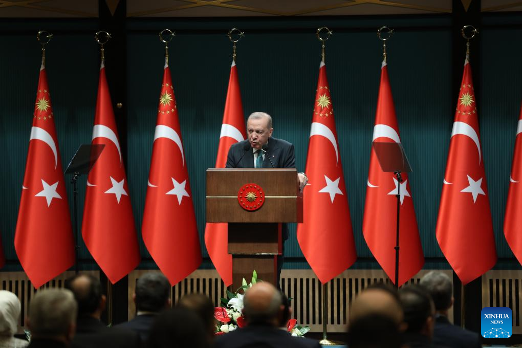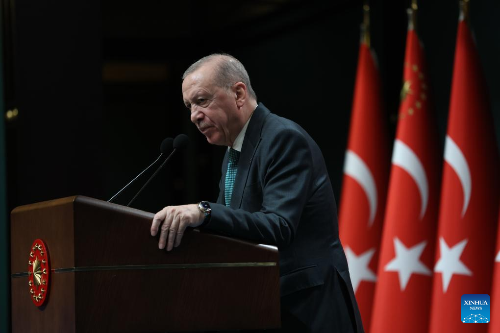Turkish President Recep Tayyip Erdogan addresses the nation following a weekly cabinet meeting at the Presidential Complex in Ankara, Türkiye, on April 6, 2026. Erdogan on Monday slammed Israel for undermining all attempts to end the Middle East conflict. (Mustafa Kaya/Handout via Xinhua)
