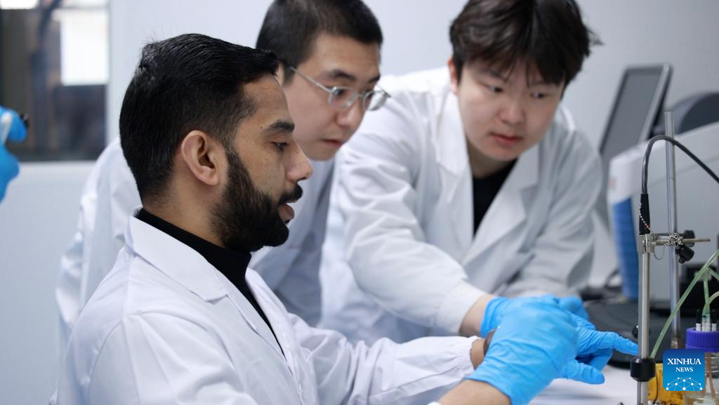 Pakistani researcher Muhammad Salman Nasir (L) conducts experiment at Tianjin University in Tianjin, north China, March 12, 2026. (Xinhua/Liu Runzhi)