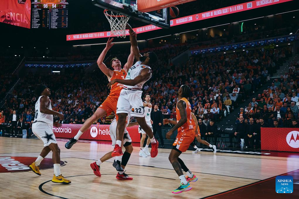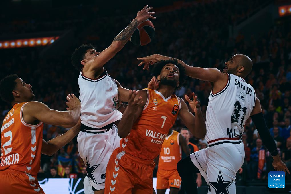 Jaime Pradilla (top R) of Valencia vies for the ball with Zach LeDay (top L) of EA7 Emporio Armani Milan during the Euroleague basketball match between Valencia and EA7 Emporio Armani Milan in Valencia, Spain, on April 7, 2026. (Photo by Pablo Morano/Xinhua)
