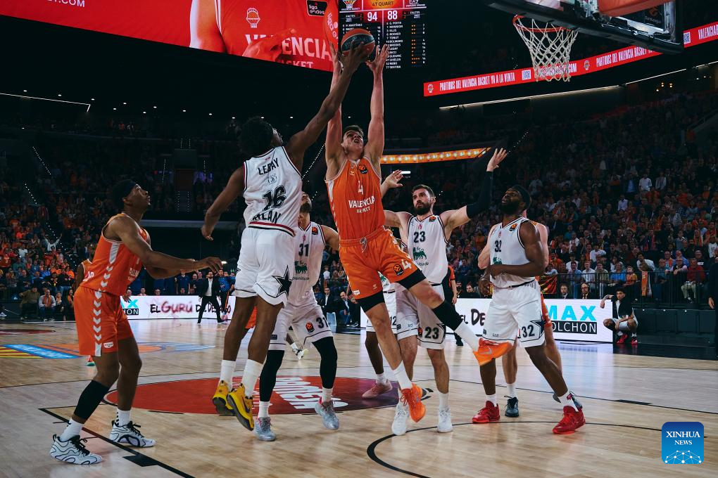 Nate Reuvers of Valencia celebrates after the Euroleague basketball match between Valencia and EA7 Emporio Armani Milan in Valencia, Spain, on April 7, 2026. (Photo by Pablo Morano/Xinhua)