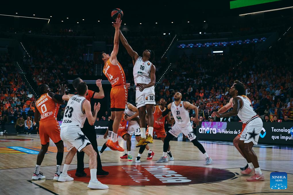 Jaime Pradilla (top L) of Valencia and Zach LeDay (top R) of EA7 Emporio Armani Milan do a jump ball during the Euroleague basketball match between Valencia and EA7 Emporio Armani Milan in Valencia, Spain, on April 7, 2026. (Photo by Pablo Morano/Xinhua)
