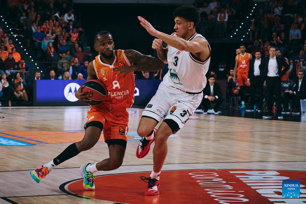 Jean Montero (L) of Valencia vies for the ball with Quinn Ellis of EA7 Emporio Armani Milan during the Euroleague basketball match between Valencia and EA7 Emporio Armani Milan in Valencia, Spain, on April 7, 2026. (Photo by Pablo Morano/Xinhua)