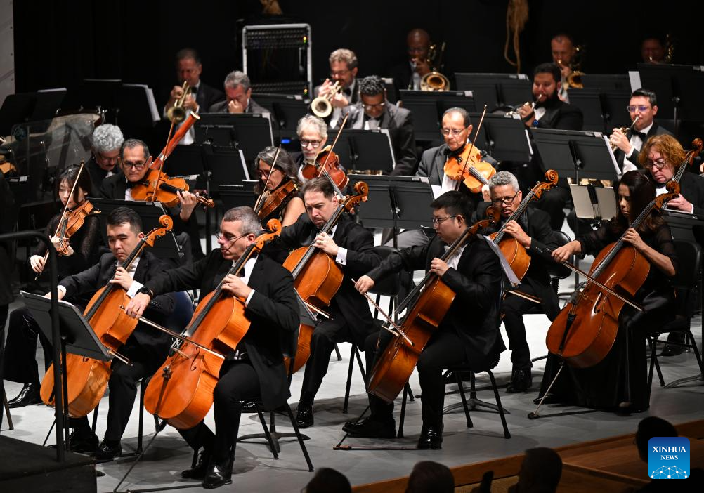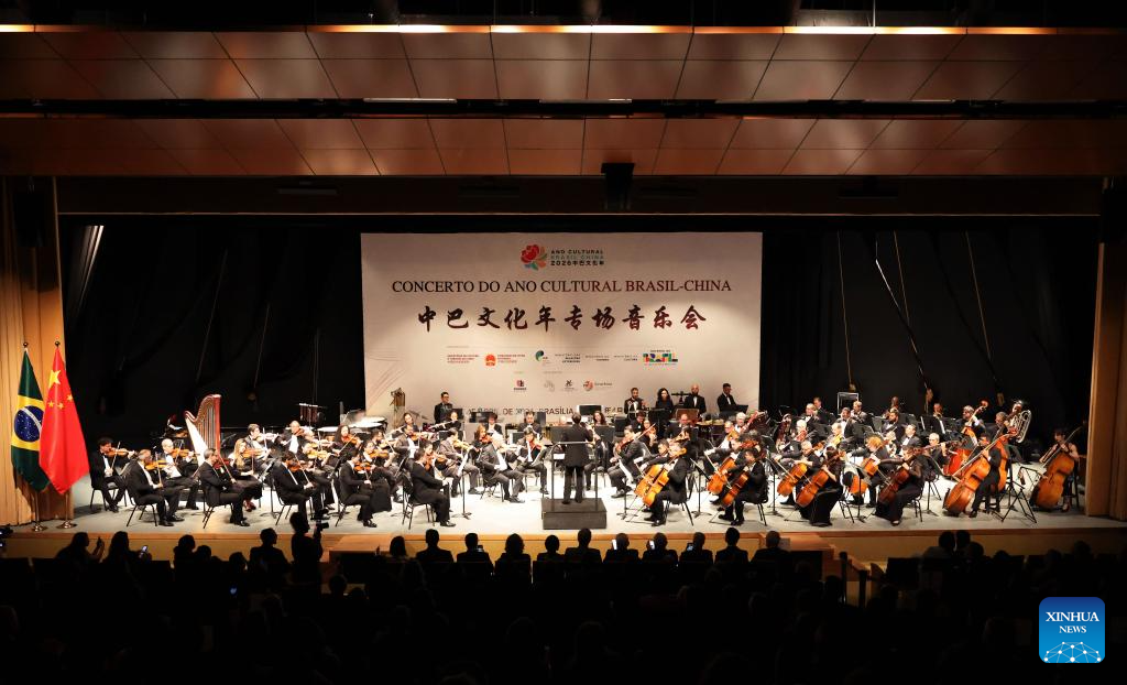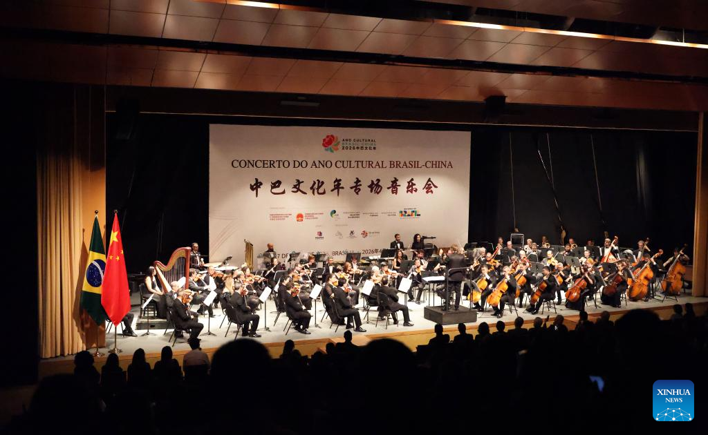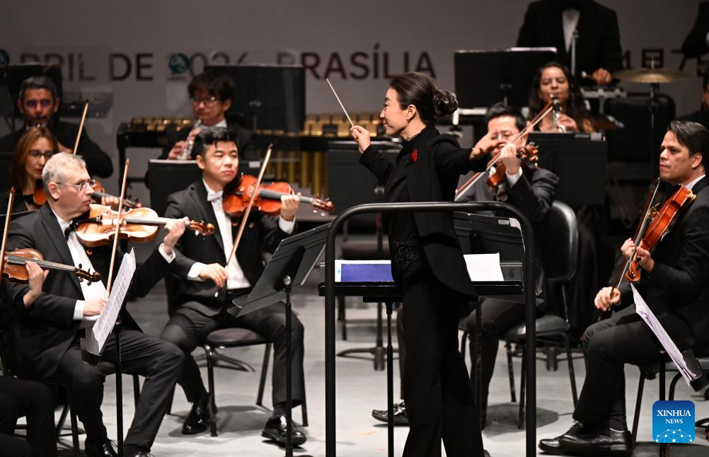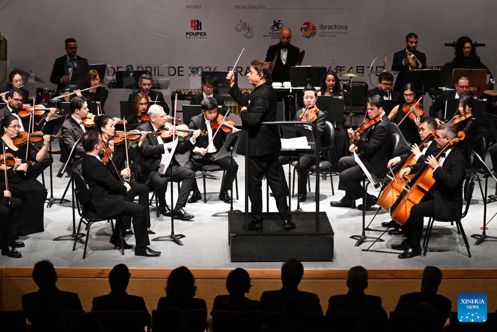 Musicians perform during the "China-Brazil Cultural Year" concert held at the FHE Poupex theatre in Brasilia, Brazil, April 7, 2026. The "China-Brazil Cultural Year" concert opened here on Tuesday. Jointly presented by the China National Symphony Orchestra and the Claudio Santoro National Theater Symphony Orchestra from Brazil, it showcased the cultural charm of both countries through a dialogue of music. (Xinhua/Jin Haoyuan)