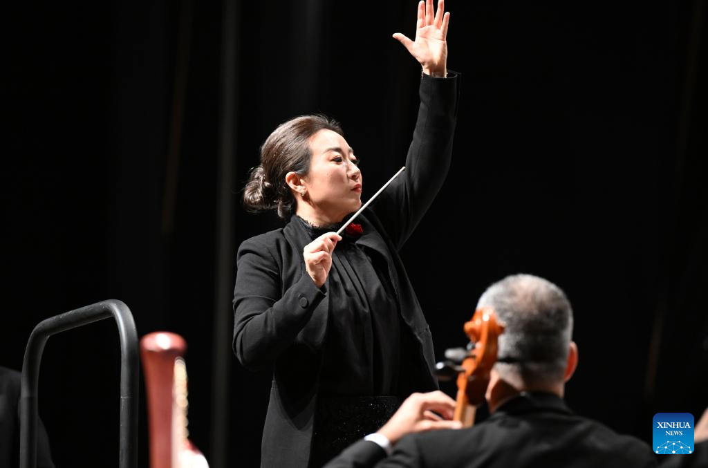 Jing Huan, principal conductor of the China National Symphony Orchestra, is pictured during the "China-Brazil Cultural Year" concert held at the FHE Poupex theatre in Brasilia, Brazil, April 7, 2026. The "China-Brazil Cultural Year" concert opened here on Tuesday. Jointly presented by the China National Symphony Orchestra and the Claudio Santoro National Theater Symphony Orchestra from Brazil, it showcased the cultural charm of both countries through a dialogue of music. (Xinhua/Jin Haoyuan)
