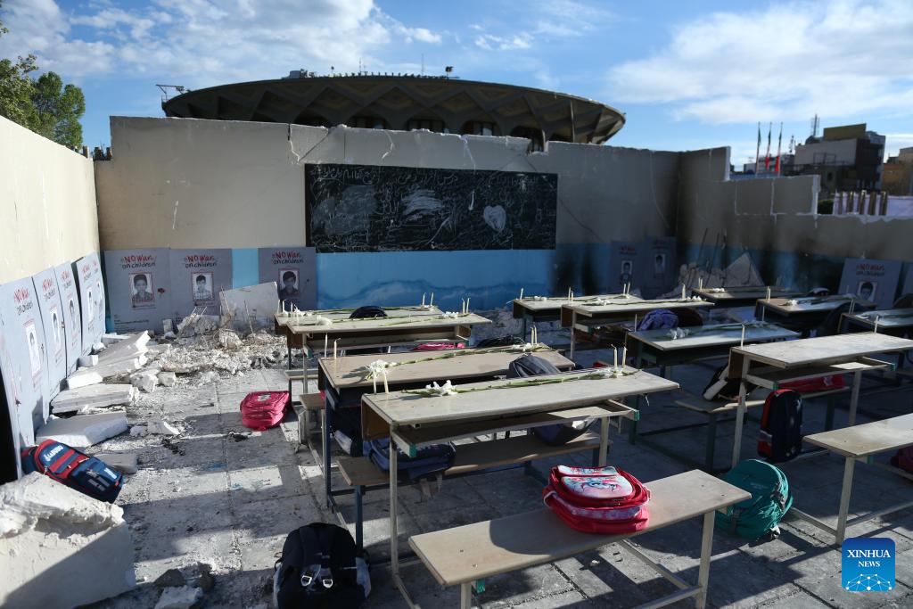 This photo taken on April 6, 2026 shows a recreated scene of a classroom at a memorial event held to mourn the students of an elementary school who were killed in a missile strike in southern Iran, in Tehran, Iran. A missile strike on an elementary school in Minab, southern Iran on Feb. 28, 2026 killed at least 175 people, most of them schoolgirls. Increasing evidence has shown this tragedy was of the U.S. making. (Xinhua/Shadati)