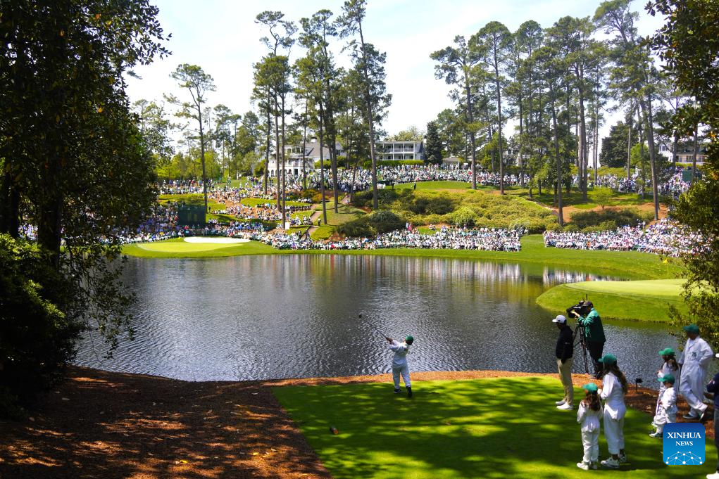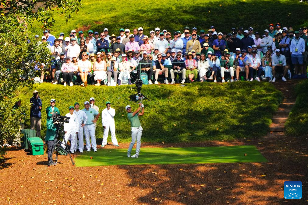 Li Haotong (front) of China hits his tee off during the par 3 contest of the 2026 Masters golf tournament at Augusta National Golf Club, in Augusta, the United States, on April 8, 2026. (Xinhua/Wu Xiaoling)