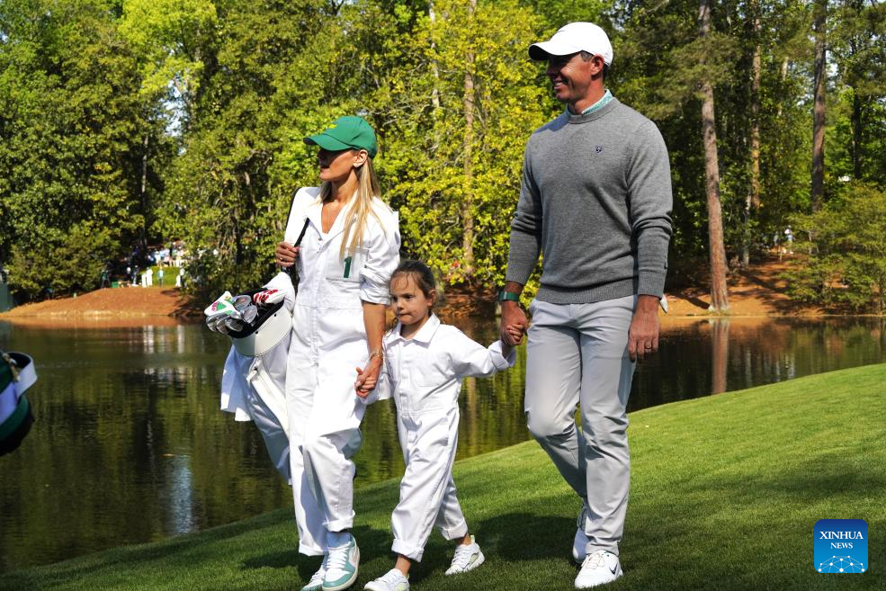 Rory McIlroy (R) of Northern Ireland walks to green with his family during the par 3 contest of the 2026 Masters golf tournament at Augusta National Golf Club, in Augusta, the United States, on April 8, 2026. (Xinhua/Wu Xiaoling)