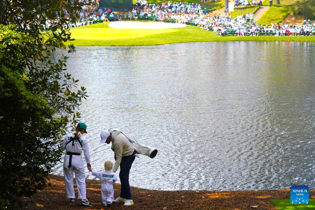 Scottie Scheffler of the United States plays with his son during the par 3 contest of the 2026 Masters golf tournament at Augusta National Golf Club, in Augusta, the United States, on April 8, 2026. (Xinhua/Wu Xiaoling)