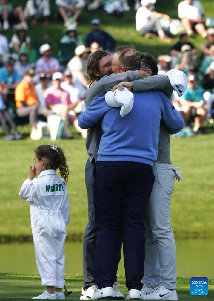 Rory McIlroy (1st R) of Northern Ireland, Tommy Fleetwood (C) of Britain and Shane Lowry (2nd L) of Ireland hug their children during the par 3 contest of the 2026 Masters golf tournament at Augusta National Golf Club, in Augusta, the United States, on April 8, 2026. (Xinhua/Wu Xiaoling)