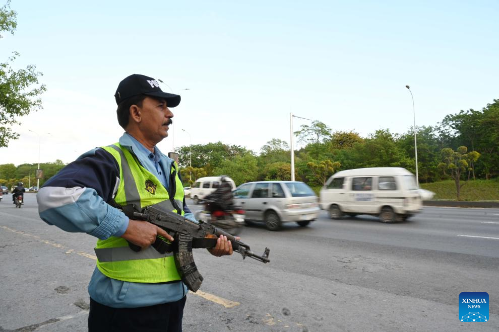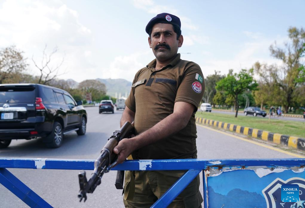 A member of armed security personnel is seen at a checkpoint in Islamabad, Pakistan, April 9, 2026. Long-awaited negotiations between the United States and Iran are set to take place in Islamabad. Pakistan has prepared a comprehensive plan to ensure foolproof security for all visiting foreign guests, Interior Minister Mohsin Naqvi said on Wednesday. (Xinhua/Wang Shen)