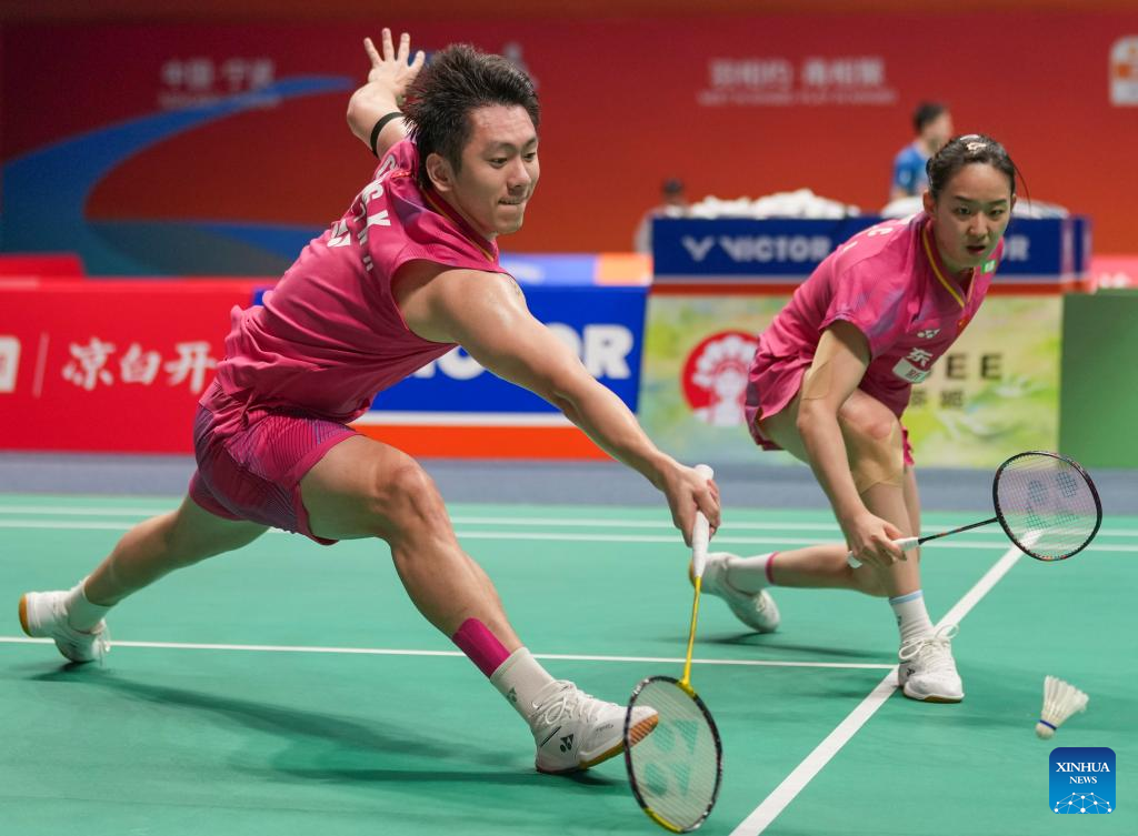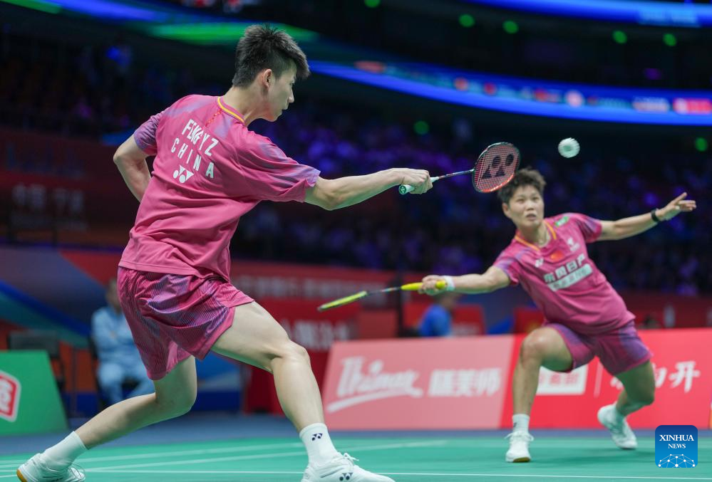 Guo Xinwa (L)/Chen Fanghui of China compete during the mixed doubles round of 16 match against Wong Tien Ci/Lim Chiew Sien of Malaysia at Badminton Asia Championships 2026 in Ningbo, east China's Zhejiang Province, April 9, 2026. (Xinhua/Sun Fei)