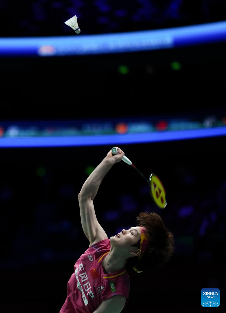Wang Zhiyi of China hits a return during the women's singles round of 16 match against Pusarla V. Sindhu of India at Badminton Asia Championships 2026 in Ningbo, east China's Zhejiang Province, April 9, 2026. (Xinhua/Sun Fei)