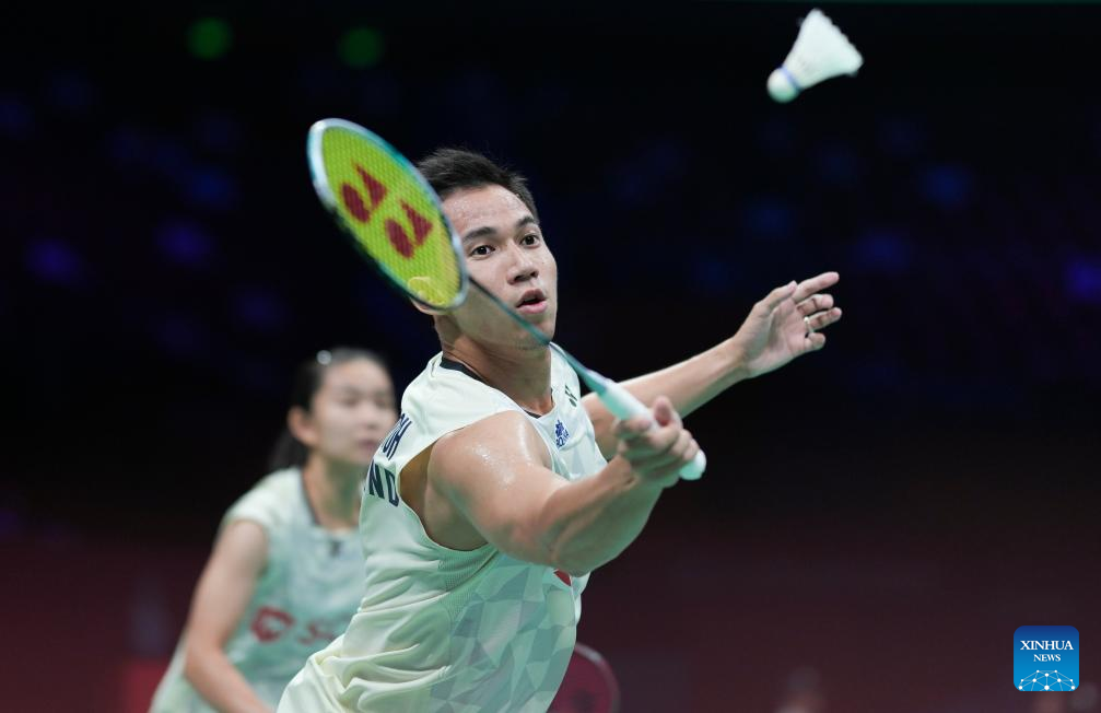 Dechapol Puavaranukroh (front)/Supissara Paewsampran of Thailand compete during the mixed doubles round of 16 match against Shimogami Yuichi/Hobara Sayaka of Japan at Badminton Asia Championships 2026 in Ningbo, east China's Zhejiang Province, April 9, 2026. (Xinhua/Sun Fei)