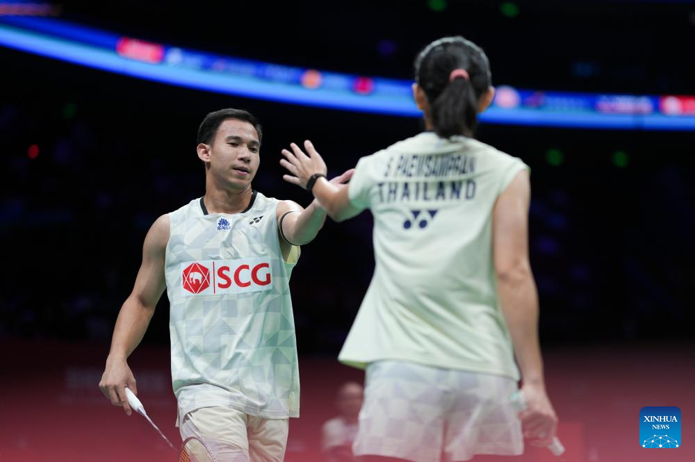 Dechapol Puavaranukroh (L)/Supissara Paewsampran of Thailand celebrate a score during the mixed doubles round of 16 match against Shimogami Yuichi/Hobara Sayaka of Japan at Badminton Asia Championships 2026 in Ningbo, east China's Zhejiang Province, April 9, 2026. (Xinhua/Sun Fei)