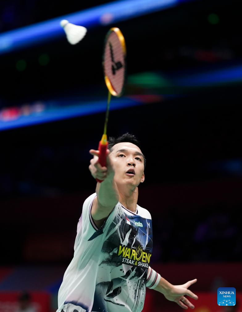 Jonatan Christie of Indonesia hits a return during the men's singles round of 16 match against Okimoto Yudai of Japan at Badminton Asia Championships 2026 in Ningbo, east China's Zhejiang Province, April 9, 2026. (Xinhua/Sun Fei)
