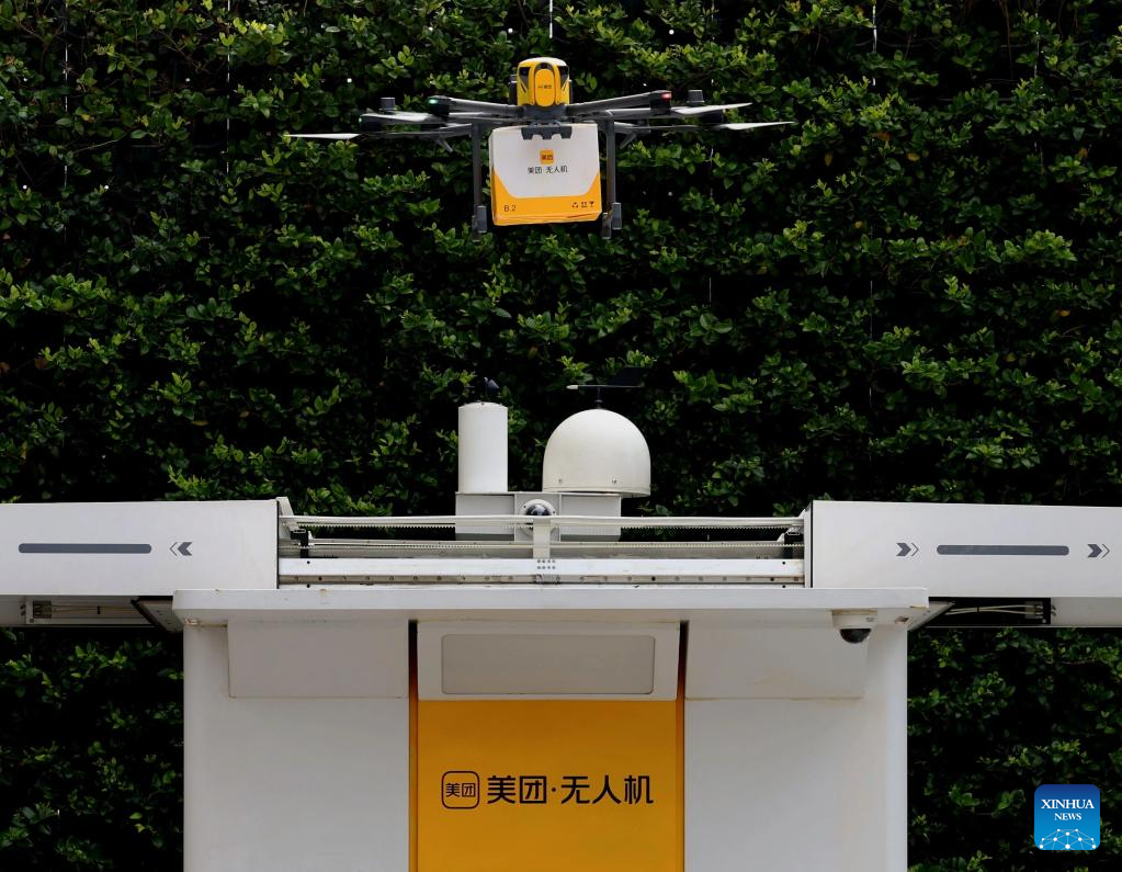 A delivery drone of Meituan, an on-demand delivery platform, prepares to land in Shanghai, east China, April 8, 2026.