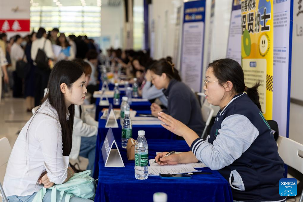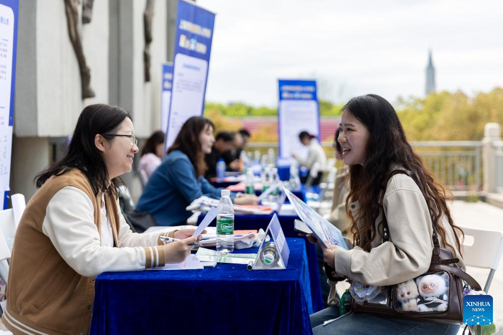 This photo taken on April 9, 2026 shows a job fair on Songjiang campus of Shanghai University of Engineering Science in east China's Shanghai. The job fair for the elderly care service was held here on Thursday. Nearly 50 organizations and enterprises offered over a hundred opportunities. (Xinhua/Wang Xiang)