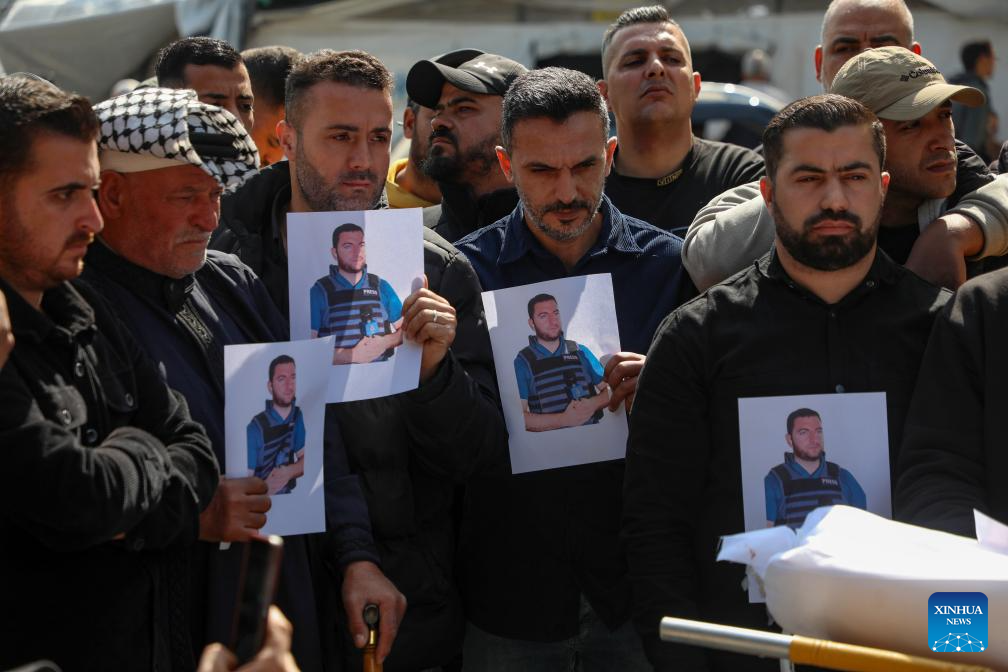 People attend a funeral of journalist Mohammed Wishah at Al-Aqsa Hospital in Deir al-Balah city, central Gaza Strip, April 9, 2026. Four Palestinians, including a journalist, were killed on Wednesday in two separate incidents of Israeli airstrikes on Gaza City, according to Palestinian security and medical sources.