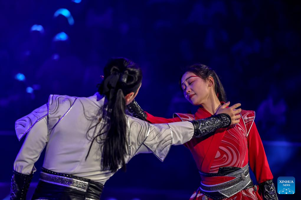 Members of China's Jiangsu Acrobatic Troupe perform in "Soaring Above the Waves," an acrobatic act combining teeterboard, trampolines and a rocking platform, during the "Ringlispil" circus show at the Capital Circus of Budapest in Budapest, Hungary, April 8, 2026. Featuring acrobatic masters from various countries, the "Ringlispil" circus show takes place here from April 4 to 12. (Photo by David Balogh/Xinhua)