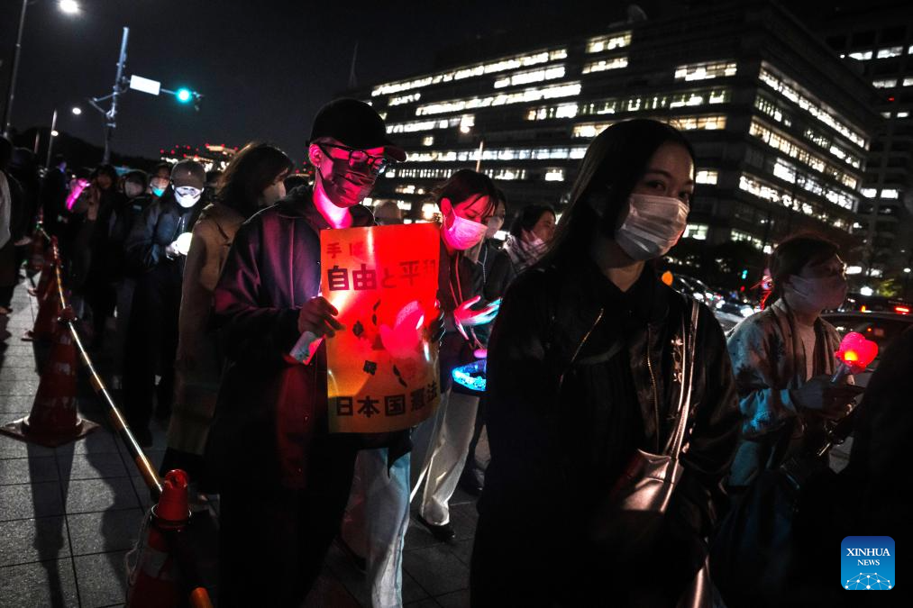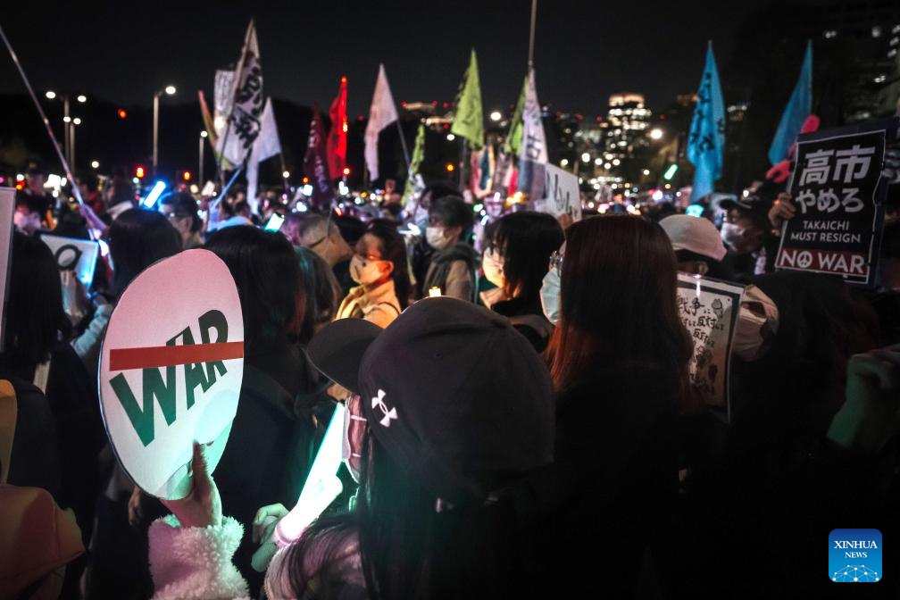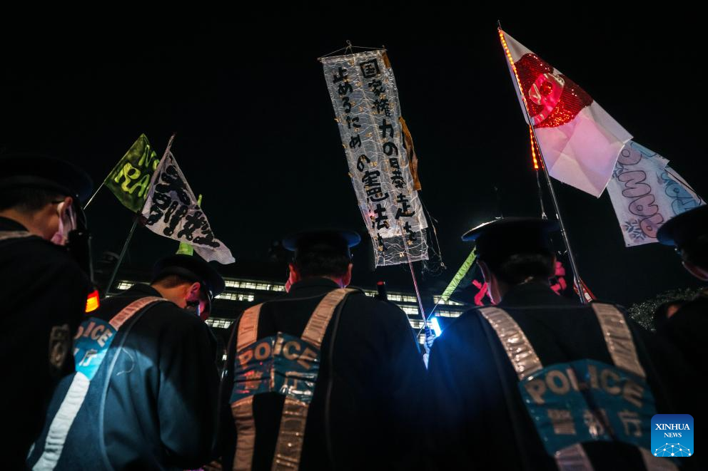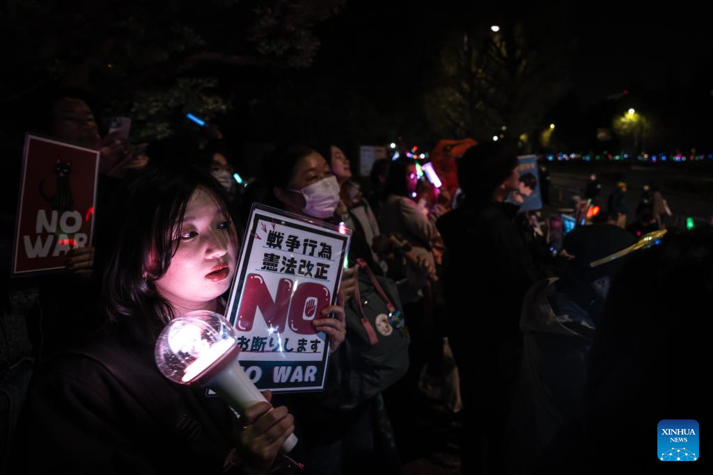 TOKYO, April 9 (Xinhua) -- A large crowd of Japanese people gathered outside the parliament building in Tokyo on Wednesday evening to protest government moves that undermine the country's pacifist constitution, including the deployment of long-range missiles and attempts to ease restrictions on lethal arms exports.