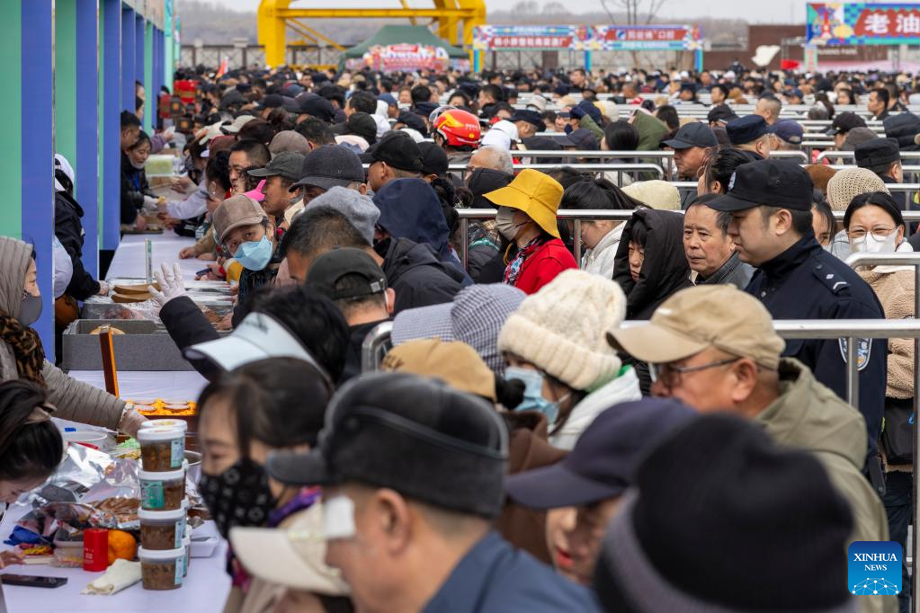 People line up for delicacies at the Hanjiang festival in Jiamusi, northeast China's Heilongjiang Province, April 10, 2026.