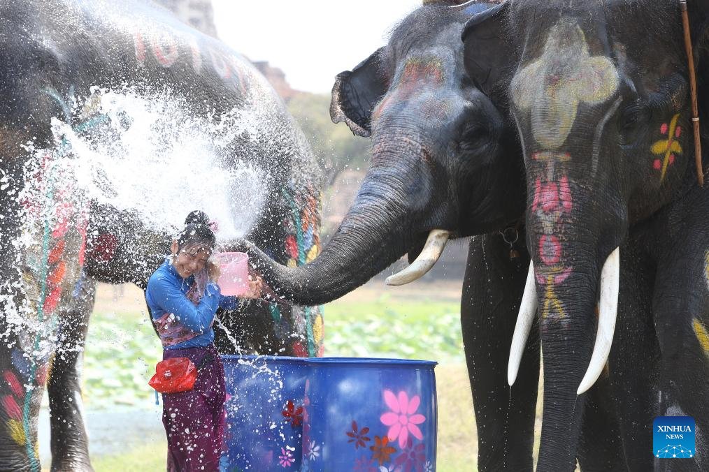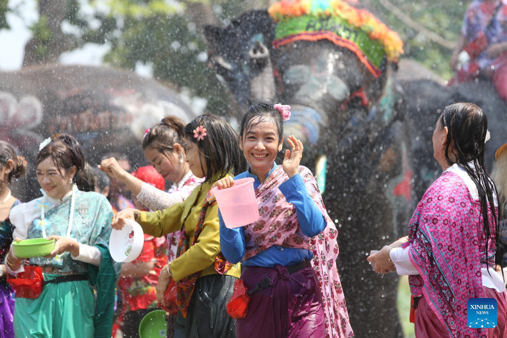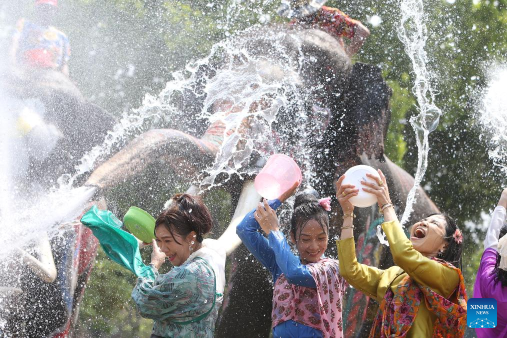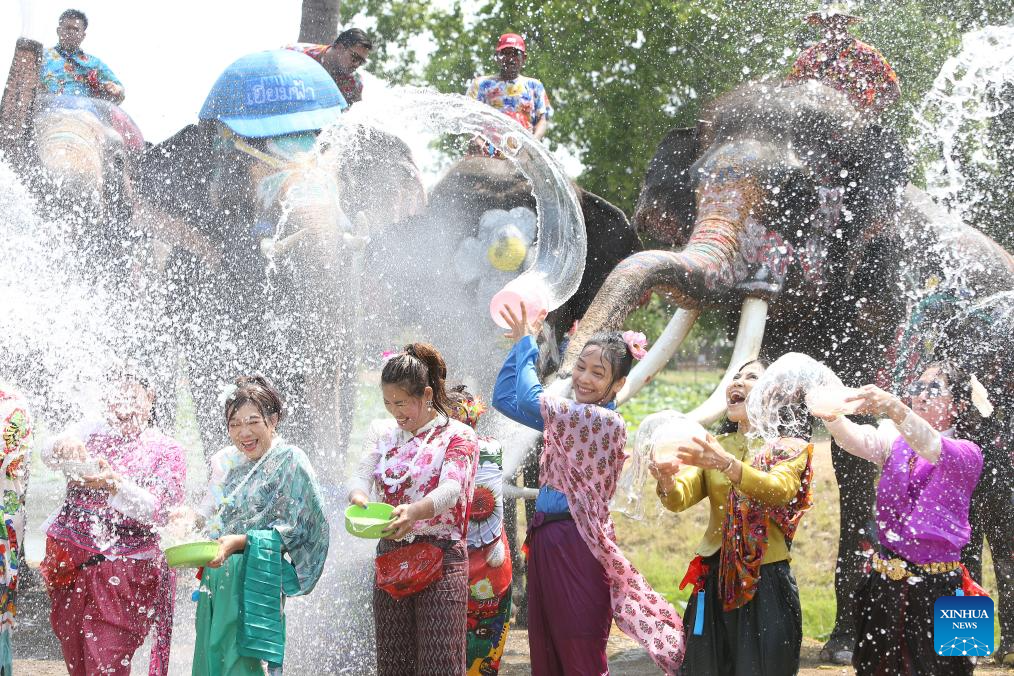 People and elephants splash water in celebration of the upcoming Songkran festival in Ayutthaya, Thailand, April 10, 2026.