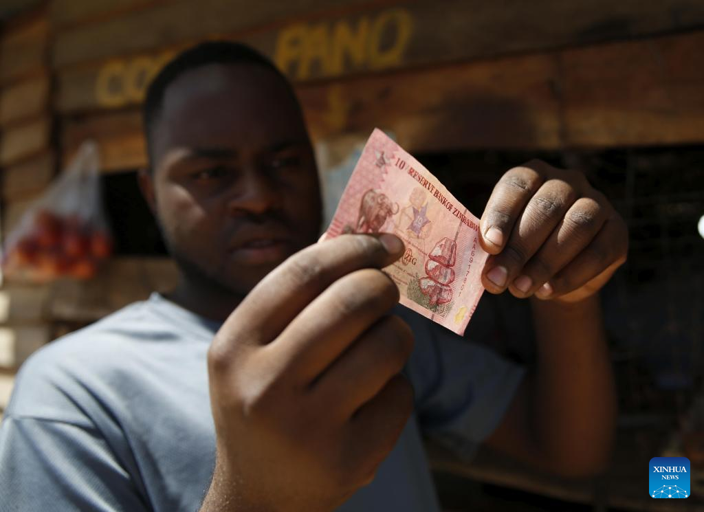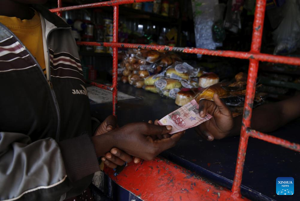 A man checks on a newly issued Zimbabwe Gold (ZiG) banknote at a tuck shop in Marondera in Mashonaland East Province, Zimbabwe on April 9, 2026. Zimbabwe officially commenced the injection of the new Zimbabwe Gold (ZiG) banknotes into the market on Tuesday. The currency entered full circulation as the new ZiG10, ZiG20, and ZiG50 denominations were disbursed through ATMs and banking halls in major cities, including Harare and Bulawayo. (Photo by Shaun Jusa/Xinhua)
