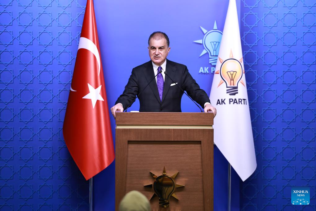 Omer Celik, spokesperson of Türkiye's ruling Justice and Development Party (AK Party), speaks during a press conference in Ankara, Türkiye, April 9, 2026. (Mustafa Kaya/Handout via Xinhua)