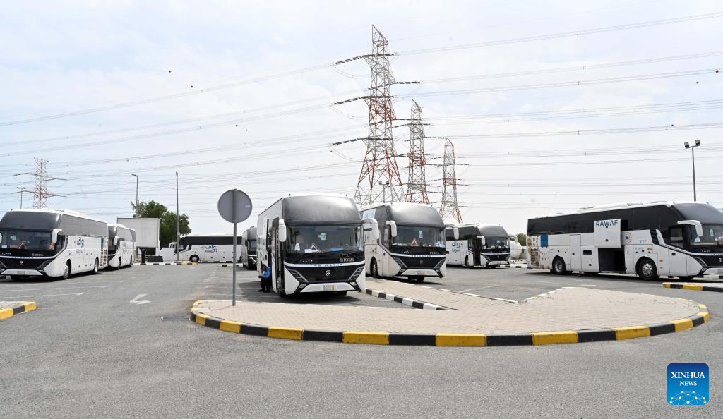 Shuttle buses wait to transport passengers to airports in Saudi Arabia at Kuwait International Fairground, which has been used as a temporary check-in site, in Hawalli Governorate, Kuwait, April 9, 2026.
