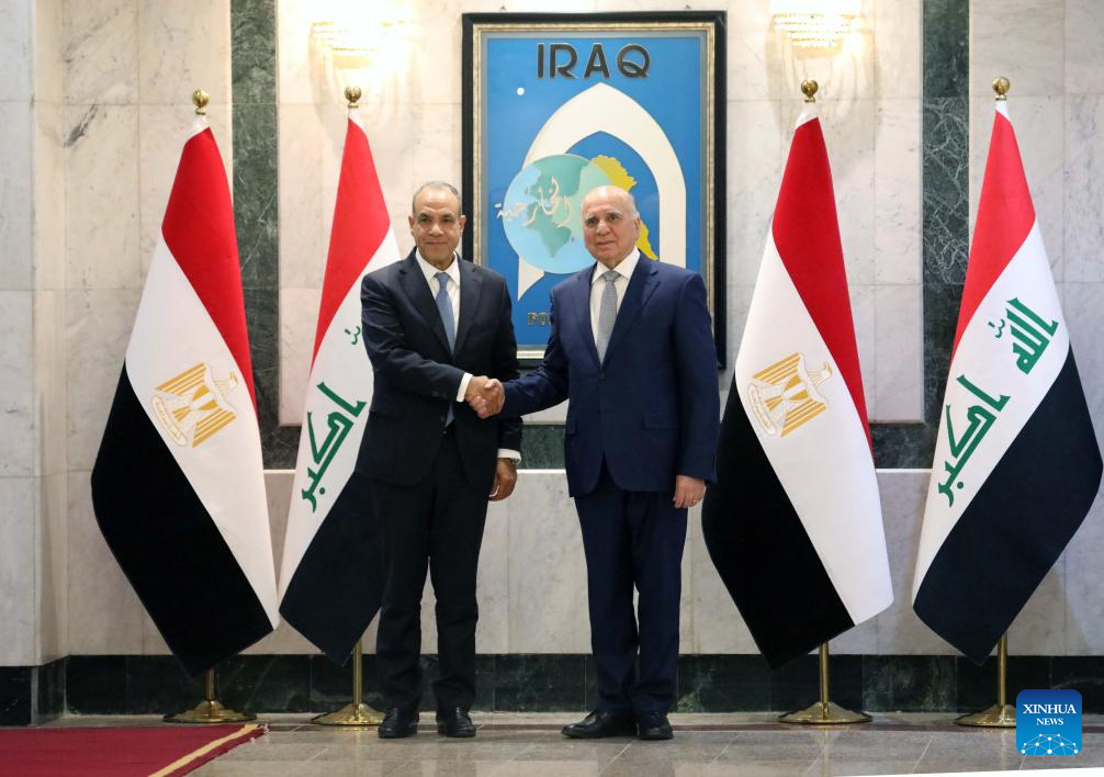 Iraqi Foreign Minister Fuad Hussein (R) shakes hands with his Egyptian counterpart Badr Abdelatty in Baghdad, Iraq, on April 9, 2026. Hussein met with Abdelatty here on Thursday evening to discuss regional de-escalation and the upcoming U.S.-Iran negotiations. (Xinhua/Khalil Dawood)