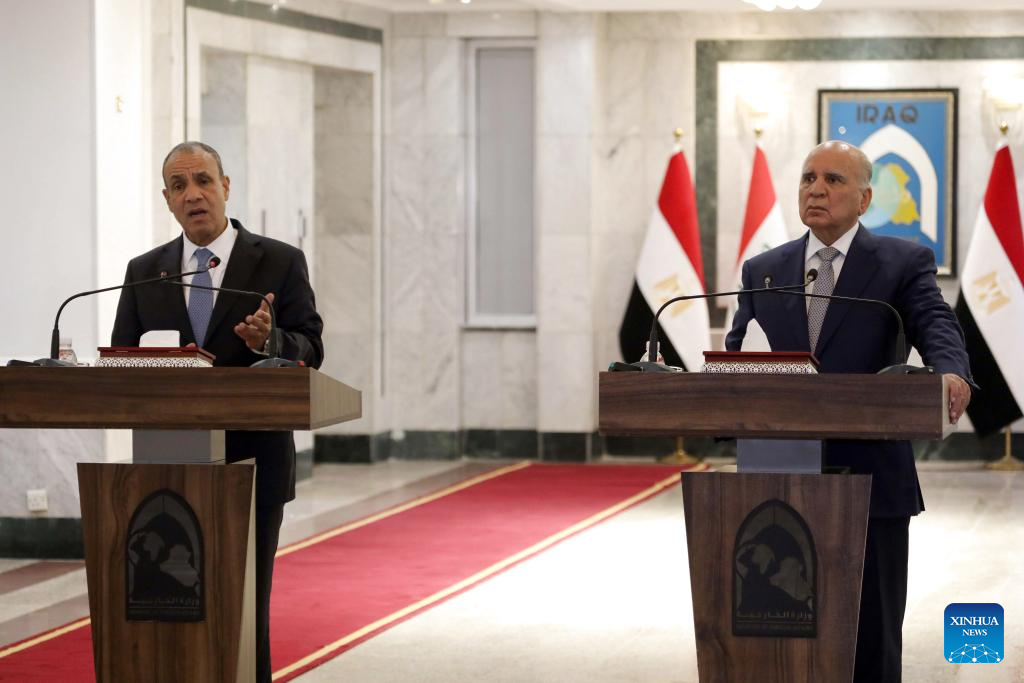 Iraqi Foreign Minister Fuad Hussein (R) attends a joint press conference with his Egyptian counterpart Badr Abdelatty in Baghdad, Iraq, on April 9, 2026. Hussein met with Abdelatty here on Thursday evening to discuss regional de-escalation and the upcoming U.S.-Iran negotiations. (Xinhua/Khalil Dawood)