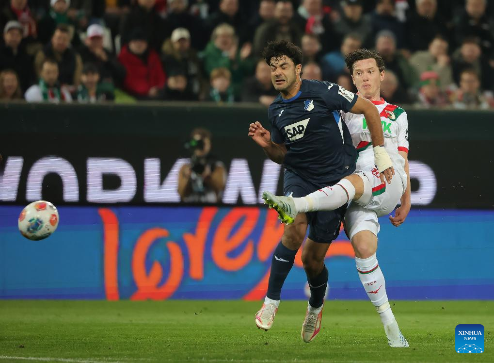 Michael Gregoritsch (R) of FC Augsburg vies with Ozan Kabak of TSG Hoffenheim during the German first division Bundesliga football match between FC Augsburg and TSG Hoffenheim in Augsburg, Germany, April 10, 2026. (Photo by Philippe Ruiz/Xinhua)