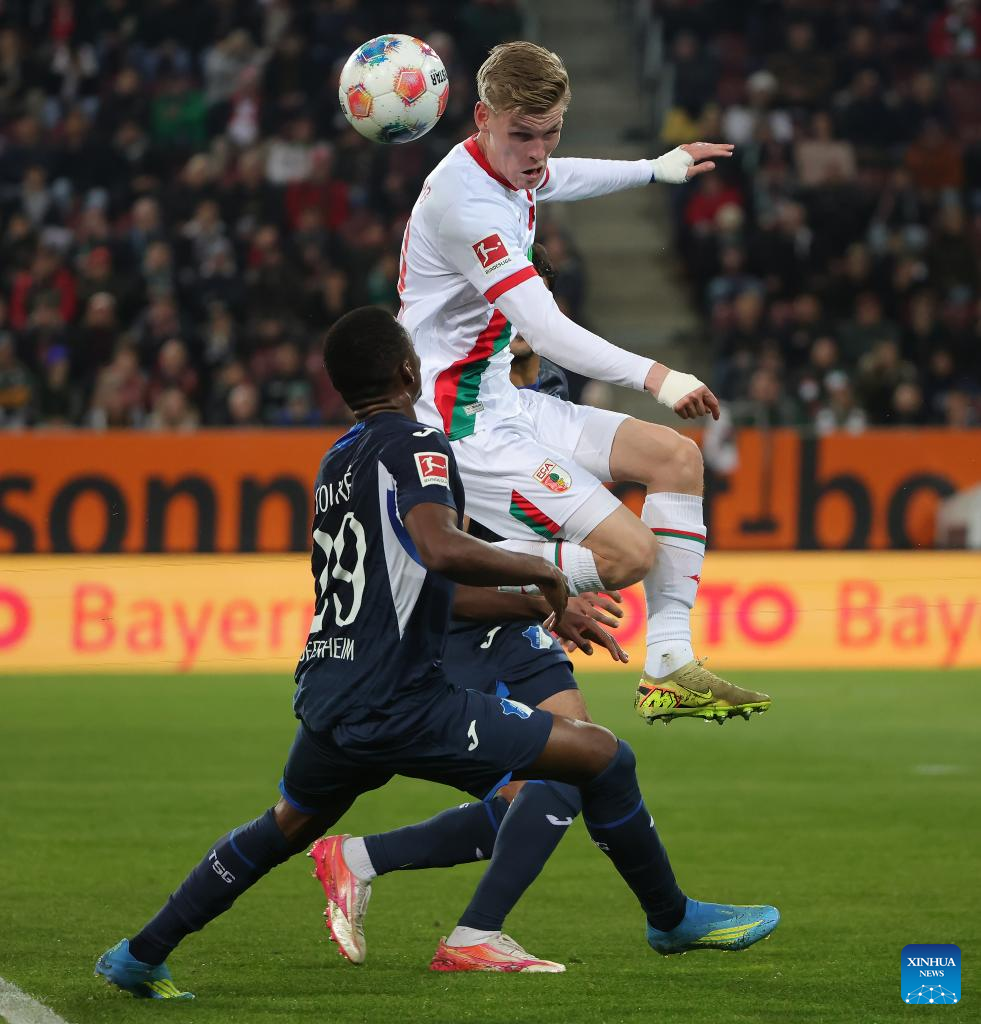Anton Kade (Up) of FC Augsburg heads for the ball during the German first division Bundesliga football match between FC Augsburg and TSG Hoffenheim in Augsburg, Germany, April 10, 2026. (Photo by Philippe Ruiz/Xinhua)