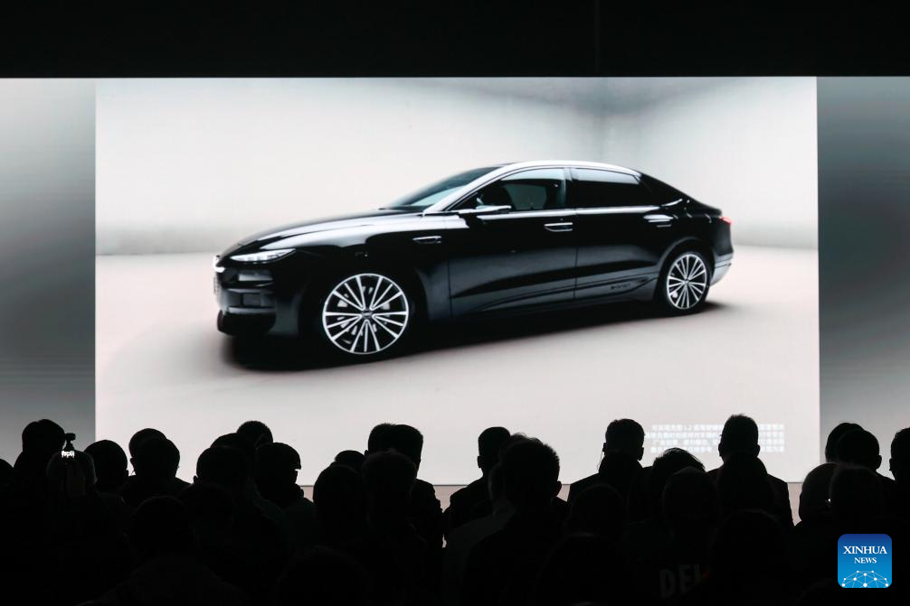 This photo taken on April 10, 2026 shows a launch event for the A6L e-tron, a battery-electric vehicle, making its debut in the Chinese market at Audi FAW NEV Co., Ltd. in Changchun, northeast China's Jilin Province. (Xinhua/Xu Chang)