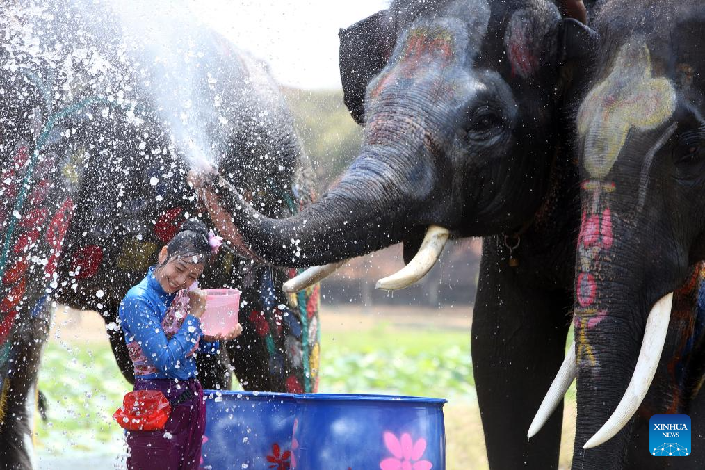 A woman interacts with an elephant during a water splashing event in celebration of the upcoming Songkran festival in Ayutthaya, Thailand, April 10, 2026.