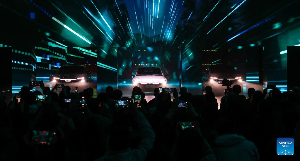 This photo taken on April 10, 2026 shows a launch event for the A6L e-tron, a battery-electric vehicle, making its debut in the Chinese market at Audi FAW NEV Co., Ltd. in Changchun, northeast China's Jilin Province. (Xinhua/Xu Chang)