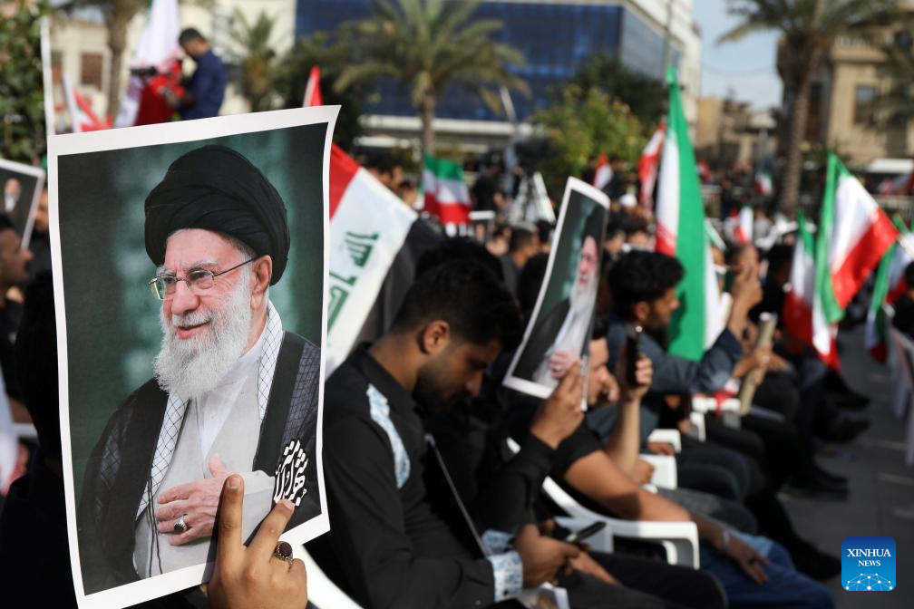People gather to mourn the death of Iran's late Supreme Leader Ali Khamenei in Baghdad, Iraq, April 10, 2026. (Xinhua/Khalil Dawood)