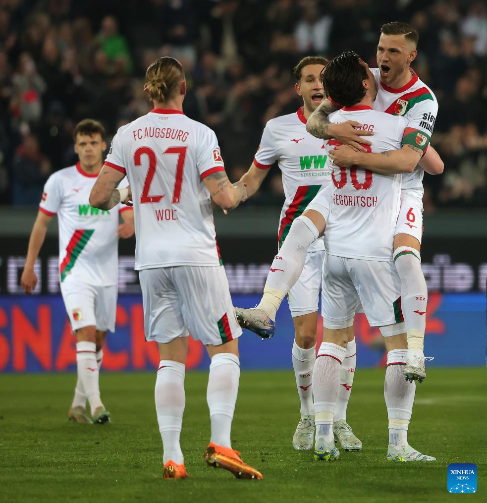 Players of FC Augsburg celebrate scoring during the German first division Bundesliga football match between FC Augsburg and TSG Hoffenheim in Augsburg, Germany, April 10, 2026. (Photo by Philippe Ruiz/Xinhua)