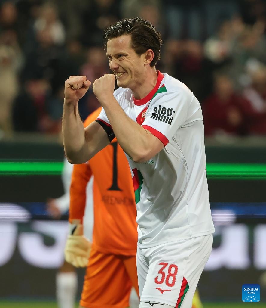 Michael Gregoritsch of FC Augsburg celebrates scoring during the German first division Bundesliga football match between FC Augsburg and TSG Hoffenheim in Augsburg, Germany, April 10, 2026. (Photo by Philippe Ruiz/Xinhua)