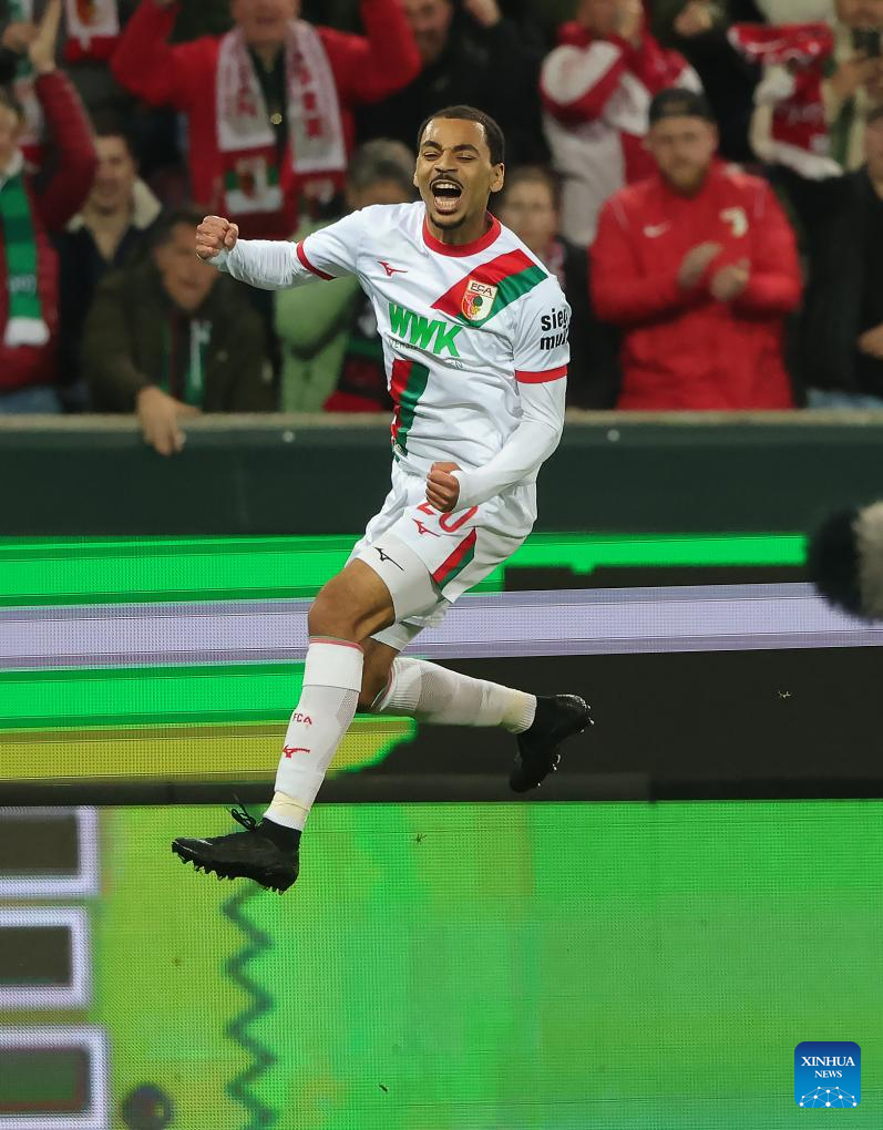 Alexis Claude Maurice of FC Augsburg celebrates scoring during the German first division Bundesliga football match between FC Augsburg and TSG Hoffenheim in Augsburg, Germany, April 10, 2026. (Photo by Philippe Ruiz/Xinhua)