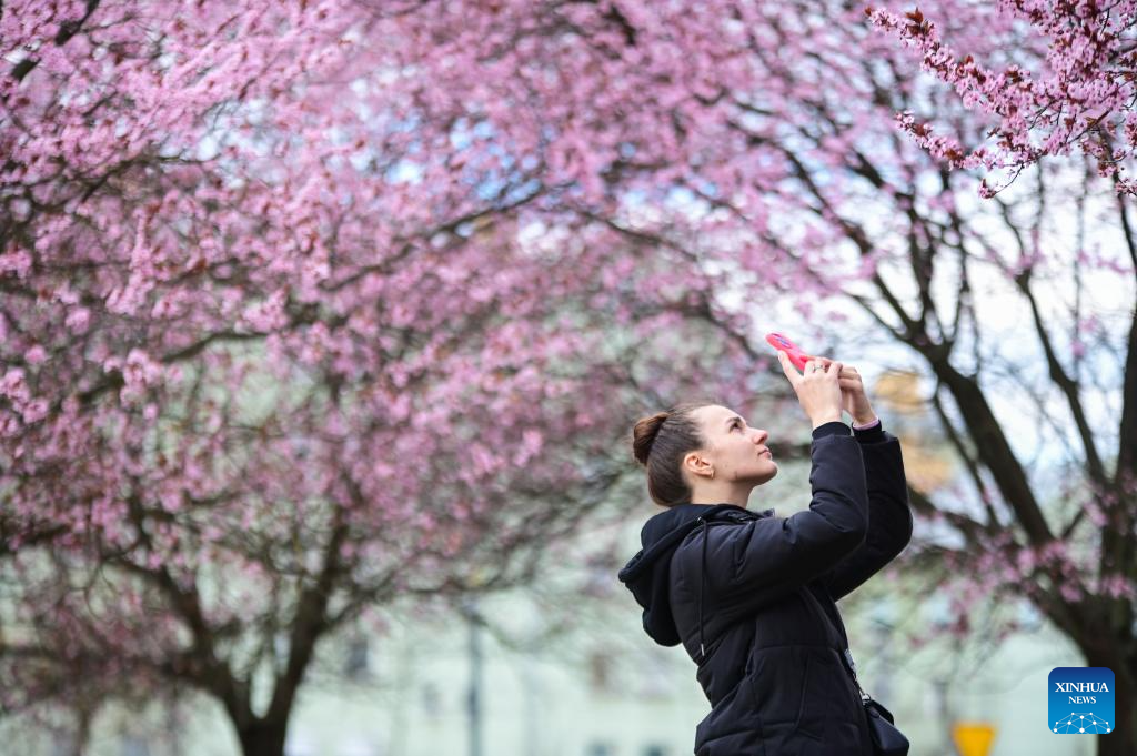 A pedestrian takes photos under blooming cherry trees in Warsaw, Poland, on April 10, 2026. (Photo by Aleksy Witwicki/Xinhua)