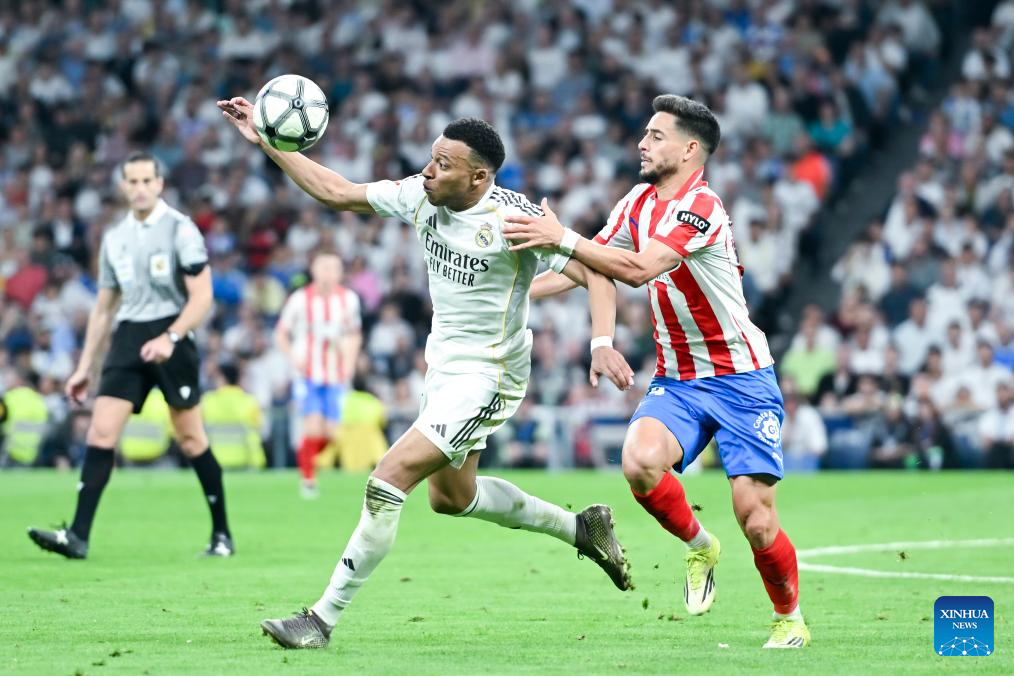 Real Madrid's Kylian Mbappe (L) vies with Girona F.C.'s Alex Moreno during the LaLiga football match between Real Madrid and Girona F.C. in Madrid, Spain, on April 10, 2026. (Photo by Gustavo Valiente/Xinhua)