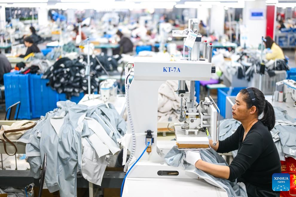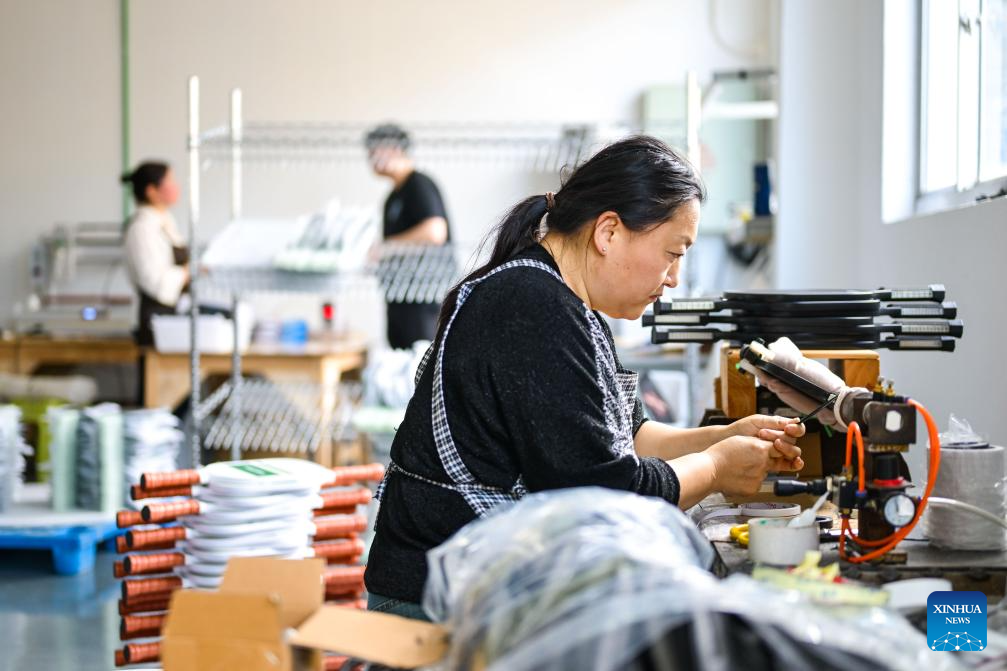 An employee works at a workshop of an enterprise in Sanmen County of Taizhou City, east China's Zhejiang Province, April 10, 2026. In recent years, Taizhou City has encouraged the cluster development of its sports goods manufacturing industry, forming several clusters including outdoor jackets, outdoor leisure products, sports glasses, and cycling and related outdoor products. (Xinhua/Jiang Han)