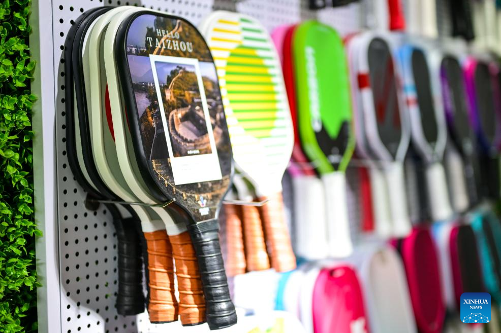 Pickleball paddles are pictured at a display hall of a sports goods manufacturing enterprise in Linhai, Taizhou City, east China's Zhejiang Province, April 10, 2026. In recent years, Taizhou City has encouraged the cluster development of its sports goods manufacturing industry, forming several clusters including outdoor jackets, outdoor leisure products, sports glasses, and cycling and related outdoor products. (Xinhua/Jiang Han)