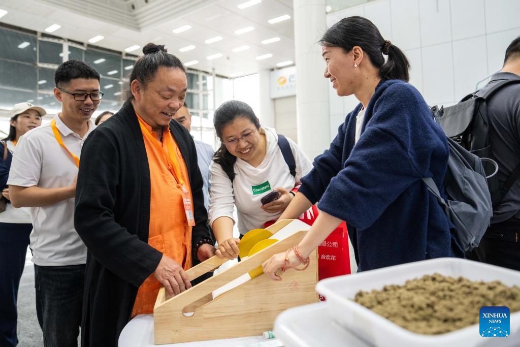 A visitor (1st R) tries to make a moxa stick at the Chinese Medicine Agriculture Expo at Hunan International Convention and Exhibition Center in Changsha, central China's Hunan Province, April 10, 2026. With a total exhibition area of 20,000 square meters, the first edition of the Chinese Medicine Agriculture Expo kicked off here on Friday, bringing together over 300 exhibitors from across the country. (Xinhua/Chen Sihan)