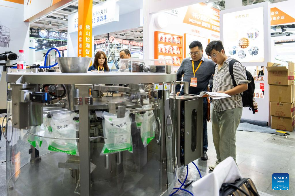 A visitor (1st R) learns about an automated medicine packaging device at the Chinese Medicine Agriculture Expo at Hunan International Convention and Exhibition Center in Changsha, central China's Hunan Province, April 10, 2026. With a total exhibition area of 20,000 square meters, the first edition of the Chinese Medicine Agriculture Expo kicked off here on Friday, bringing together over 300 exhibitors from across the country. (Xinhua/Chen Sihan)