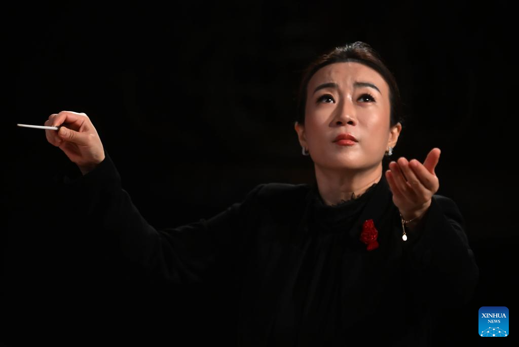 Jing Huan, principal conductor of the China National Symphony Orchestra, gestures at a concert celebrating the China-Brazil Cultural Year in Fortaleza, Ceara, Brazil, April 11, 2026. (Photo by Lucio Tavora/Xinhua)