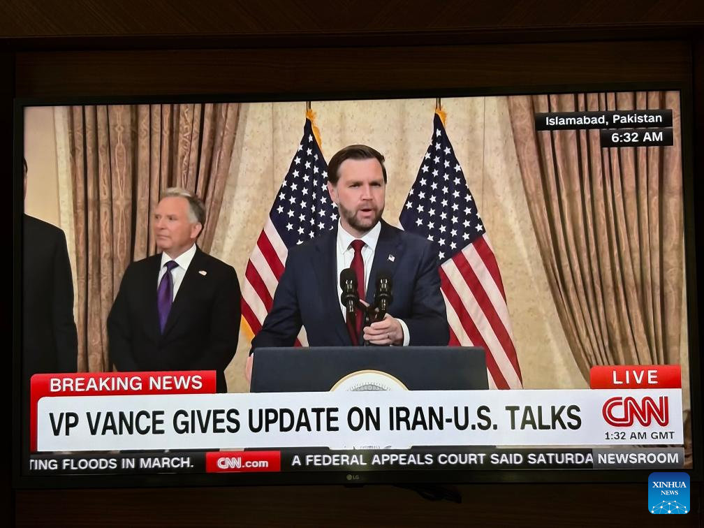 This photo taken on April 12, 2026 shows a screen displaying a televised press conference by the U.S. delegation in Islamabad, Pakistan. No agreement was reached between the United States and Iran in the latest round of talks held in Islamabad, U.S. Vice President JD Vance said here on Sunday, as negotiations concluded without a breakthrough despite intensive engagement. (Xinhua/Wang Shen)