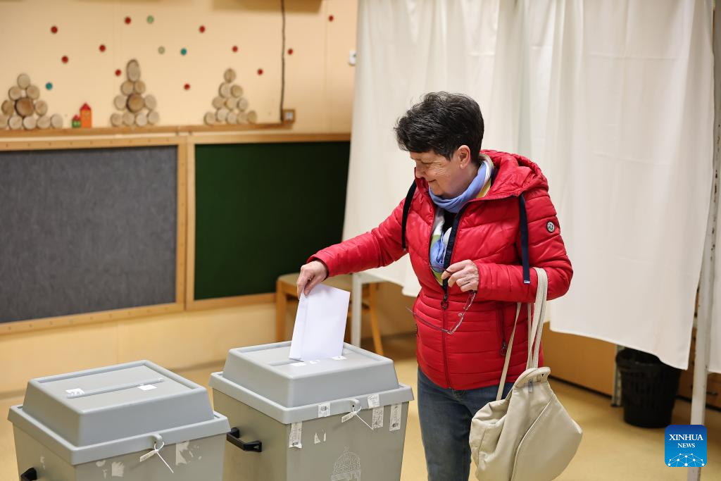A voter is about to cast her ballot at a polling station in Budapest, Hungary, April 12, 2026. Hungary's parliamentary elections kicked off at 6:00 a.m. local time (0400 GMT) on Sunday, with about 8.1 million eligible voters, according to the National Election Office. (Photo by Laszlo Balog/Xinhua)